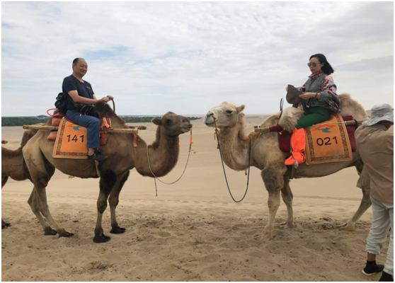 后坡的驼队,一队接着一队。牵引驼的人走在前面,骑驼人坐在驼峰之间,双手把稳驼鞍,两眼注视前方,欣赏着大漠孤烟直,黄河落日圆的壮景。叮咚的驼铃声,律动着驼背上的骑人,有节奏地的向前起伏着。快意是最基本的享受,只是那股驼子异味,稍稍有点不适。到达终点后,骆驼会在牵引驼者的口令下,乖乖地前腿跪沙,跪下身子。骑者这才收脚下鞍,稳稳落地。