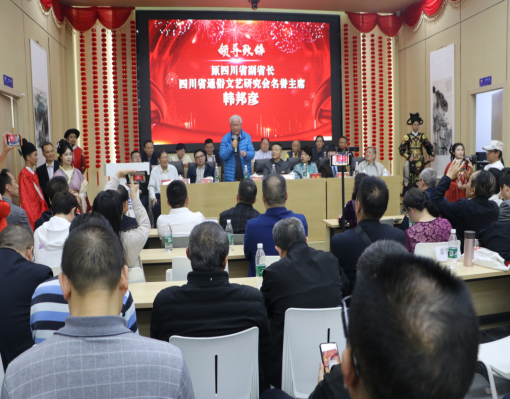 主持人介绍了到会领导和嘉宾后,四川省通俗文艺研究会会长陈家甫致欢迎词。