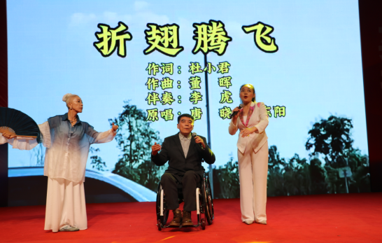李东阳先生,唐晓、田虹女士表演歌舞《折翅腾飞》,展示身残志坚的最强音。